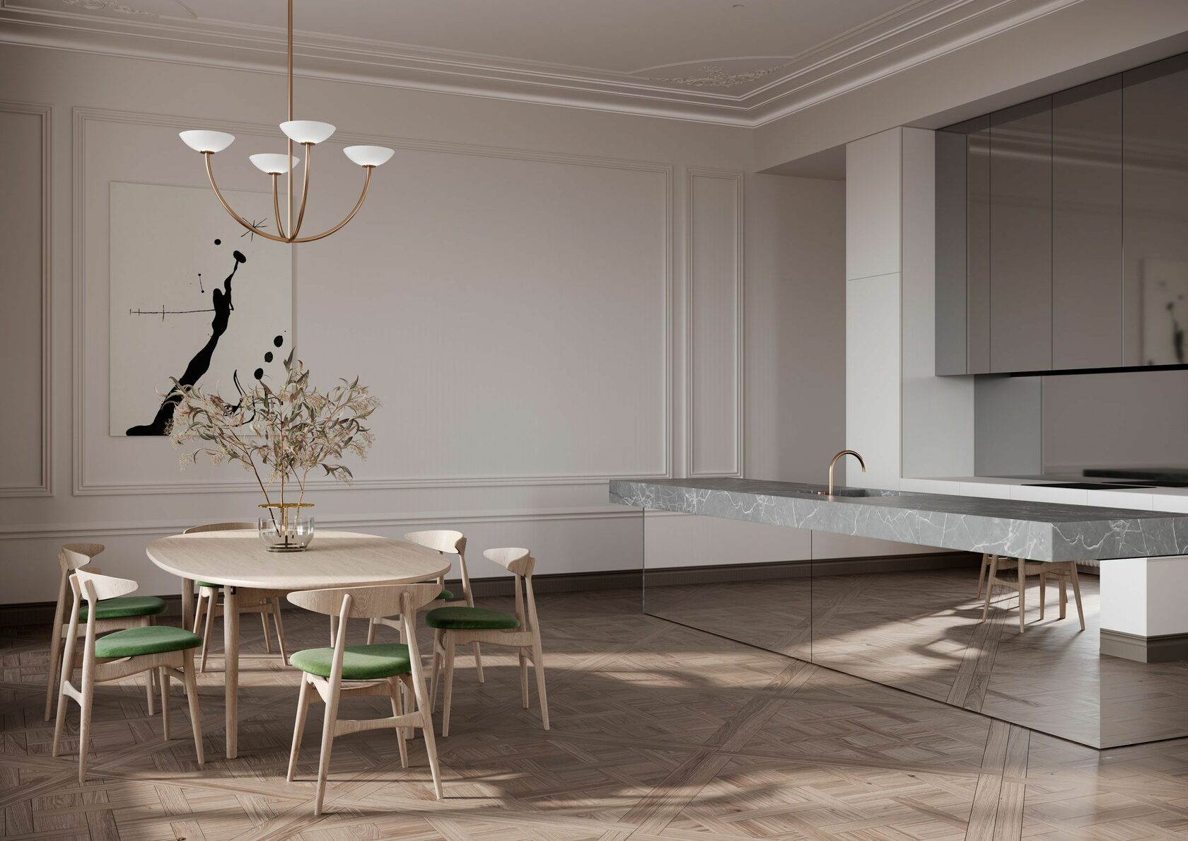 Закрытая от посторонних глаз и машин территория «Дома с Атлантами» оформлена зелёными насаждениями и кустарниками высотой до 3 метров. Жители смогут гулять в сквере с дорожками и беседками