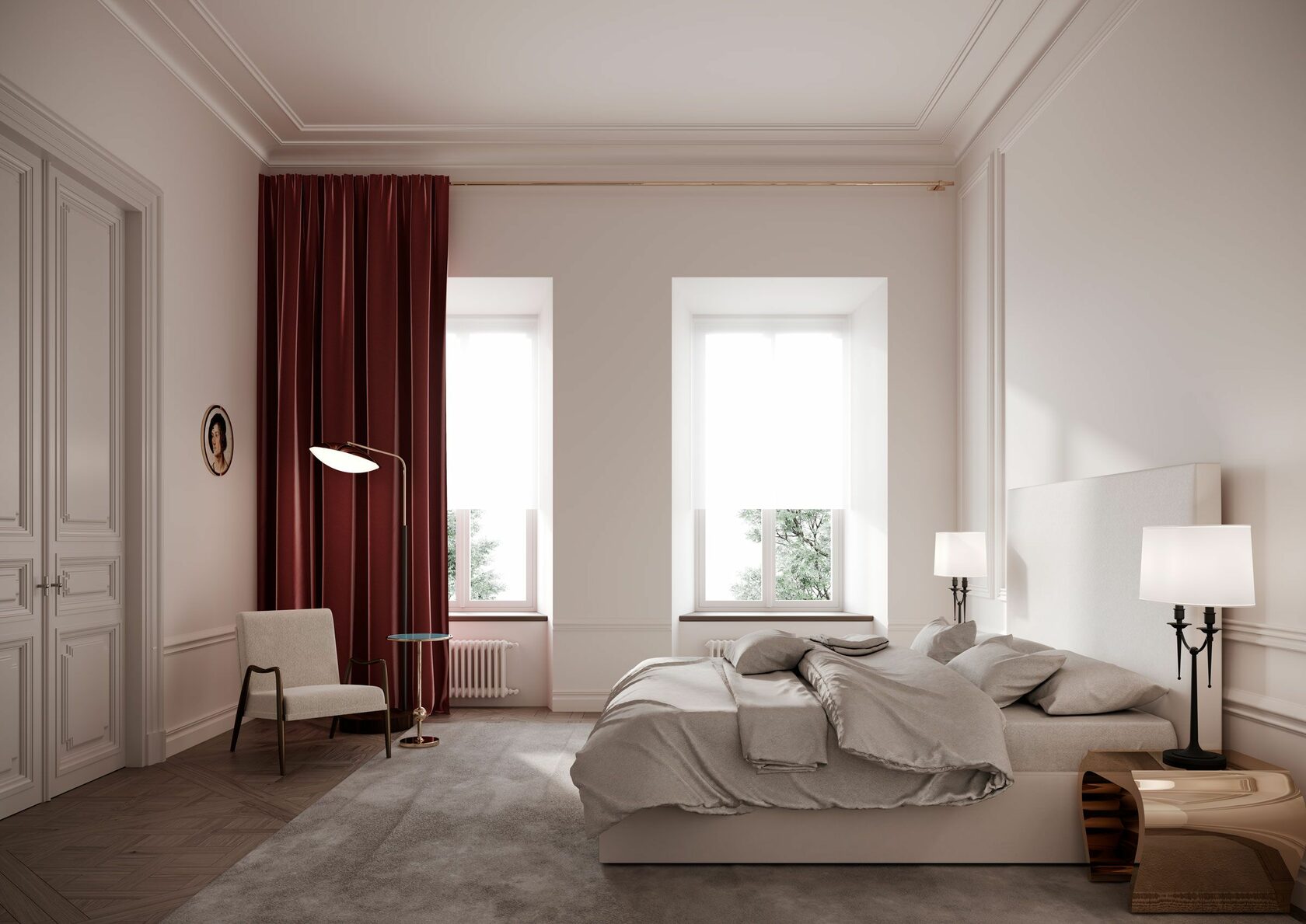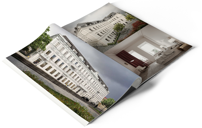 Авторы реконструкции сохранили внешний облик «Дома с Атлантами» – восстановили историческую кирпичную кладку, лепнину и цвет фасада, заменили перекрытия, фундамент и коммуникации. Лобби оформлено натуральным камнем по авторскому проекту