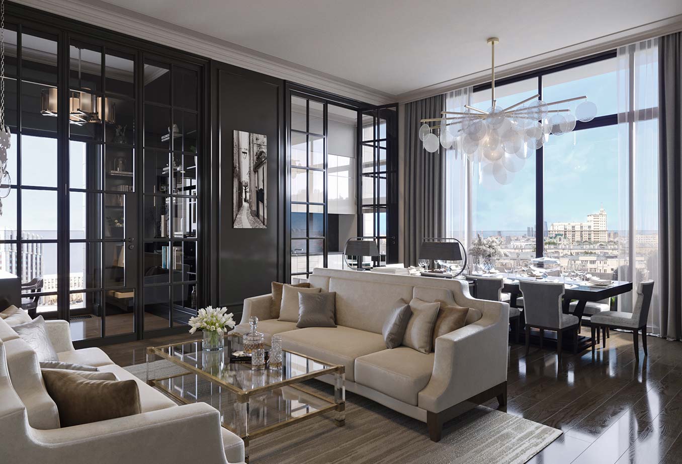Для «Полянки/44» международное архитектурное бюро Aedas разработало дизайн лобби всех особняков. Специалисты использовали природный камень, дерево, кожу и шёлк
